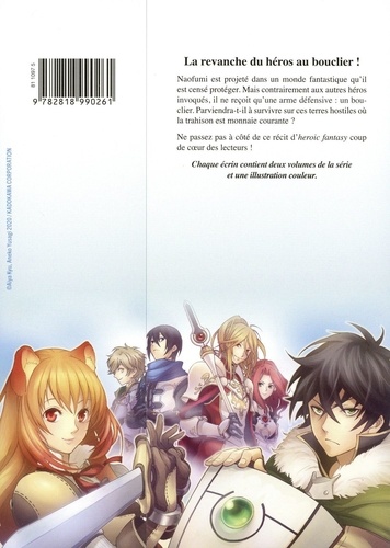 La revanche du héros au bouclier ! Naofumi est projeté dans un monde fantastique qu'il est censé protéger. Mais contrairement aux autres héros invoqués, il ne reçoit qu'une arme défensive : un bouclier. Parviendra-t-il à survivre sur ces terres hostiles où la trahison est monnaie courante ? Ne passez pas à côté de ce récit d'heroic fantasy coup de coeur des lecteurs ! Chaque écrin contient deux volumes de la série et une illustration couleur.