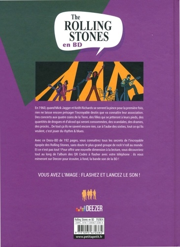 En 1960, quand Mick Jagger et Keith Richards se serrent la pince pour la première fois, rien ne laisse encore présager l'incroyable destin que va connaître leur association. Des concerts aux quatre coins de la Terre, des filles qui se jetteront à leurs pieds, des quantités de drogues et d'alcool qui seront consommées, des scandales, des drames, des procès... De tout ça ils ne savent encore rien, car à l'aube des sixties, tout ce qu'ils veulent, c'est jouer du rhythm & blues. Avec ce Docu-BD de 192 pages, vous connaîtrez tous les secrets de l'incroyable épopée des Rolling Stones, sans doute le plus grand groupe de rock'n'roll au monde. Et ce n'est pas tout ! Pour offrir une nouvelle dimension à la lecture, vous découvrirez tout au long de l'album des QR Codes à flasher avec votre téléphone : ils vous mèneront sur Deezer pour écouter, à fond, la bande son de la BD !