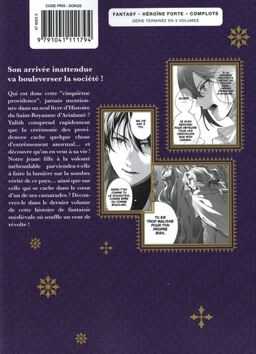 Son arrivée inattendue va bouleverser la société ! Qui est donc cette "cinquième providence", jamais mentionnée dans un seul livre d'Histoire du Saint-Royaume d'Arialantë ? Yulith comprend rapidement I que la cérémonie des providences cache quelque chose d'extrêmement anormal... et découvre qu'on en veut à sa vie ! i Notre jeune fille à la volonté d'inébranlable parviendra-t-elle à faire la lumière sur la sombre vérité de ce pays... ainsi que sur celle qui se cache dans le coeur d'un de ses camarades ? Découvrez-le dans le dernier volume de cette histoire de fantaisie médiévale où souffle un vent de révolte !