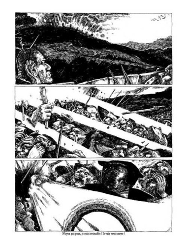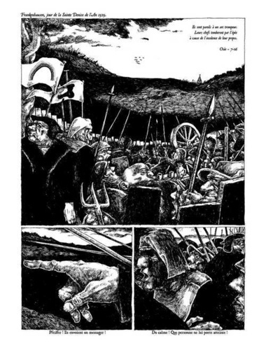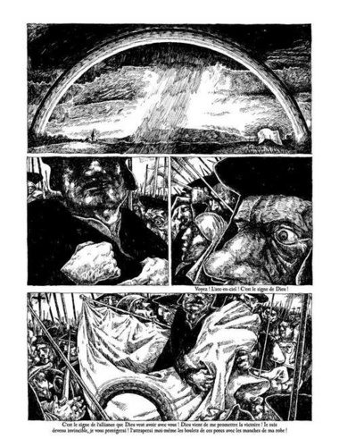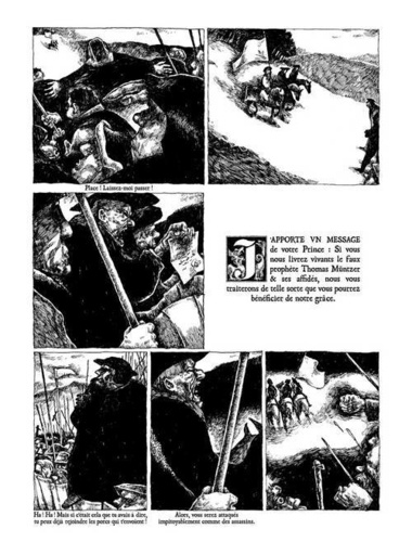 (Texte provisoire) Thomas Münzer constitue le second volume de la trilogie " La passion des Anabaptistes ". Il aborde la théorisation de la révolution et conte le second soulèvement populaire du début du xvie siècle dans le Saint-Empire romain germanique. Pendant les guerres paysannes, le jeune Martin Luther prit la défense des paysans et des miséreux et prêcha des idées plutôt guerrières, suggérant par exemple de " se laver les mains avec le sang des évêques et des cardinaux de Rome ". La jeune secte anabaptiste, à cette même époque (1517), adhéra pleinement au discours de Luther et diffusa avec lui une haine énergique de Rome. Apparut ensuite, vers les années 1520, un certain Thomas Münzer, jeune théologien atypique qui se fit rapidement connaître comme le nouvel héros de la révolte paysanne et mit en place une véritable ligue secrète et séditieuse, ayant pour objectif de déstabiliser le pouvoir en place. Ses discours étaient plus durs encore que ceux prêchés par Luther, si bien que ce dernier fit marche arrière assez rapidement et opta pour la diplomatie, préférant les intrigues et les compromissions avec les instances au pouvoir. Dérouté par ce Münzer venu de nulle part, Luther s'éloigna de plus en plus des vues du champion des anabaptistes et finit par lui jeter publiquement l'anathème. Né en 1968, David Vandermeulen s'est d'abord fait connaître en 1997 en fondant le mythique café-concert " Le Galactica ", point de rendez-vous prisé de la scène underground bruxelloise. C'est à la même époque qu'il s'intéresse à la bande dessinée en montant sa propre structure éditoriale, Clandestine Books. Il y publie ses premiers albums puis rejoint 6 Pieds sous Terre et Les Requins Marteaux. Il crée Monsieur Vandermeulen, un avatar digne de l'Oncle Paul, auteur de nombreuses vulgarisations littéraires, à l'instar de son essai remarqué sur l'ontologie de Jean-Claude Van Damme. En 2005, il surprend ses lecteurs en prouvant qu'il est aussi capable de rompre avec l'humour qui le caractérisait jusqu'alors. Sa série Fritz Haber, nommée deux fois dans la catégorie album de l'année puis meilleure série au FIBD d'Angoulême, reçoit en 2005 le Prix de la BD historique de Blois et s'impose comme un titre incontournable en ce domaine. En parallèle, il développe avec son complice Daniel Casanave l'ambitieuse série Romantica aux Editions Le Lombard, une collection de grandes biographies d'auteurs romantiques du XIXe siècle. Toujours au Lombard, il a publié Ric Remix, un étonnant détournement de Ric Hochet. David Vandermeulen est également un contributeur régulier de La Revue Dessinée et de Fluide Glacial. Laurent Sautet est né en 1971 à Lyon et vit actuellement à Paris. Sous le pseudonyme Ambre, il crée sa propre revue Hard Luck en 1991 et la maison d'édition Terre Noire en 1997. Son premier ouvrage de bande dessinée paraît en 1996 et il publie de nombreux récits dans les revues Le cheval sans tête, Jade... et participe au collectif Comix 2000 de l'Association. Il adapte " Une trop bruyante solitude " de Bohumil Hrabal en 2003 avec Lionel Tran et le " Faust " de Goethe en 2006 avec David Vandermeulen. Ambre expose régulièrement ses peintures dans des galeries et des festivals internationaux. Il est par ailleurs Bibliothécaire à la Bibliothèque nationale de France. Pour le projet " La Passion des Anabaptistes ", il décide d'étudier la gravure allemande de la Renaissance et radicalise son approche de la bande dessinée.