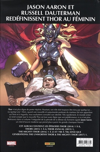 Thor n'est plus digne de porter Mjolnir. Pourtant, son rôle doit toujours être tenu par quelqu'un... ou quelqu'une ! Alors, quand une nouvelle et surpuissante porteuse du marteau fait son apparition sur Terre et à Asgardia, tous souhaitent connaître son identité. Très rapidement, le monde entier se rend compte que la nouvelle Thor est tout aussi digne que son prédécesseur, si ce n'est plus. Retrouvez dans ce volume l'intégralité de la période de la déesse du Tonnerre signée Jason Aaron, un chef-d'oeuvre moderne qui prend place parmi les grands classiques Marvel.