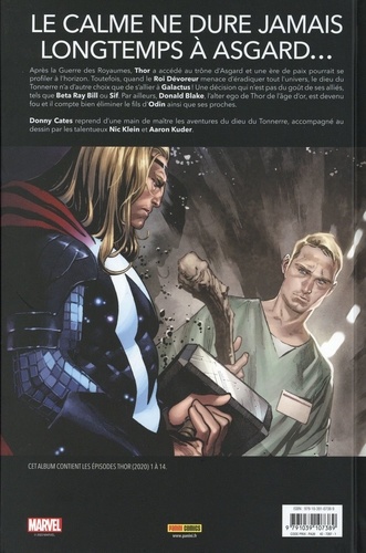Après la Guerre des Royaumes, Thor a accédé au trône d'Asgard et une ère de paix pourrait se profiler à l'horizon. Toutefois, quand le Roi Dévoreur menace d'éradiquer tout l'univers, le dieu du Tonnerre n'a d'autre choix que de s'allier à Galactus ! Une décision qui n'est pas du goût de ses alliés, tels que Beta Ray Bill ou Sif. Par ailleurs, Donald Blake, l'alter ego de Thor de l'âge d'or, est devenu fou et il compte bien éliminer le fils d'Odin ainsi que ses proches. Donny Cates reprend d'une main de maître les aventures du dieu du Tonnerre, accompagné au dessin par les talentueux Nic Klein et Aaron Kuder.