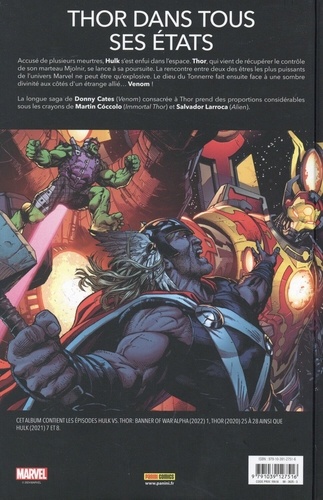 Accusé de plusieurs meurtres, Hulk s'est enfui dans l'espace. Thor, qui vient de récupérer le contrôle de son marteau Mjolnir, se lance à sa poursuite. La rencontre entre deux des êtres les plus puissants de l'univers Marvel ne peut être qu'explosive. Le dieu du Tonnerre fait ensuite face à une sombre divinité aux côtés d'un étrange allié... Venom ! La longue saga de Donny Cates (Venom) consacrée à Thor prend des proportions considérables. sous les crayons de Martin Coccolo (Immortel Thor) et Salvador Larroca (Alien).