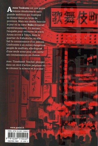 Azusa Tsugumo rêve de devenir chercheuse dans une grande université publique, mais ses espoirs sont ruinés quand elle découvre que son mentor, le professeur qu'elle admire, s'est approprié les résultats de ses recherches. Dépitée, Azusa accepte un poste de professeur de chimie dans un lycée. La vie d'enseignante n'est pas facile. La jeune femme subit en effet les moqueries des élèves et endure le harcèlement moral de leurs parents, pourtant le plus dur est devant elle... Le jour où sa soeur Ruka, sa seule famille, disparaît mystérieusement, elle se lance alors à sa recherche mais découvre rapidement que des clans de yakuzas sont mêlés à cette disparition. Evidemment, Azusa devient leur cible ! Seule et démunie face à ces dangereux criminels, Azusa ne peut compter que sur ses connaissances en physique et chimie pour s'en sortir ! Yanagi Takakuchi est un jeune auteur qui a commencé sa carrière avec un one shot intitulé Magical Sister dans le shonen Jump+ en 2020. C'est finalement l'année d'après qu'il débute sa première série : Timebomb Teacher (Hara Hara Sensei en VO). Mettant en scène une jeune chercheuse qui voit son monde partir en lambeaux, cette série nous plonge dans une spirale infernale. Face à son envie de retrouver sa soeur, elle doit prendre son courage à deux mains pour s'opposer à des criminels de la pire espèce. Jouant autant sur l'enquête qui entoure cette disparition que sur l'action qui en découle, ce titre en 4 tomes nous délivre une histoire haletante qui ne cesse de monter en puissance. Quand une prof de chimie décide de prendre les choses en main, cela fait forcément des étincelles !