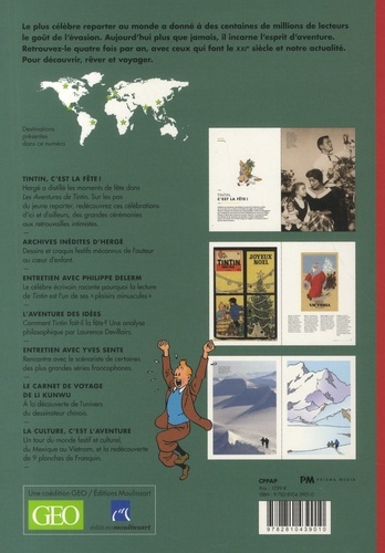 Dans ce numéro - un grand dossier sur la fête - 16 p. de croquis et de planches inédites sur (la thématique de la fête), issus des archives Moulinsart - Un grand entretien l'écrivain Philippe Delerm et Yves Sente - Un sujet "Profession : reporter" sur les tourismes de survie - Le magnifique " Carnet de voyage " de Li Kunwu à Cuba - Un sujet " l'Aventure des idées " par Laurence Devillairs. - Des " Cases de l'histoire " de Herzog, vainqueur de l'Annapurna, qui a inspiré Tintin au Tibet - Un sujet " Aventure de l'extrême " sur les sports d'hiver de l'extrême pratiqués au Japon - Un sujet " La culture c'est l'aventure " sur la thématique de la fête, avec 9 planches BD imaginées par Franquin Noël et l'Elaoin.
