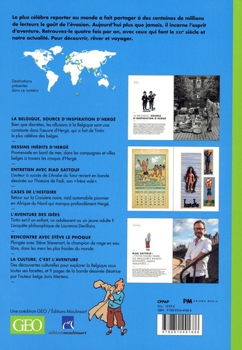 Le plus célèbre reporter au monde a fait partager à des centaines de millions de lecteurs le goût de l'évasion. Aujourd'hui plus que jamais, il incarne l'esprit d'aventure. Retrouvez-le quatre fois par an, avec ceux qui font le XXI siècle et notre actualité. Pour découvrir, rêver et voyager. La Belgique, source d'inspiration d'Hergé. Bien que discrètes, les allusions à la Belgique sont une constante dans l'oeuvre d'Hergé, qui a fait de Tintin le plus célèbre des belges. Dessins inédits d'Hergé. Promenade en bord de mer, dans les compagnes et villes belges à travers les croquis d'Hergé. Entretien avec Riad Sattouf. L'auteur à succès de L'Arabe du futur revient en bande dessinée sur l'histoire de Fadi, son "frère volé". Cases de l'histoire. Retour sur la Croisière noire, raid automobile pionnier en Afrique du Nord qui marqua profondément Hergé. Rencontre avec Stève le phoque. Plongée avec Stève Stievenart, le champion de nage en libre, dans les mers les plus froides du monde. La culture, c'est l'aventure. Des découvertes culturelles pour explorer la Belgique sous toutes ses facettes, et 9 pages de la bande dessinée Béatrice par l'auteur belge Joris Mertens.
