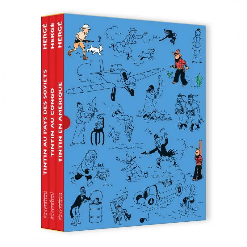 Totalement différentes de l’édition courante, les planches de Tintin publiées dans Le Petit Vingtième entre janvier 1929 et octobre 1932 révèlent un graphisme plus rond, spontané et souple, mais aussi un art de la composition influencé par l’Art déco. Dans cette première manière d’Hergé s’affirme déjà l’élégante stylisation qui s’épanouira plus visiblement encore à partir du Lotus bleu. Confiée à Tintinimaginatio, cette colorisation respecte les traits et aplats noirs tracés et posés par Hergé, mais propose une palette inédite de couleurs qui amplifie la lisibilité du récit et la clarté des dessins de façon surprenante, offrant ainsi une nouvelle lecture de ces albums. Cette campagne de colorisation portera sur les neuf premiers albums parus en feuilleton dans Le Petit Vingtième, puis Le Soir-Jeunesse. Chaque volume est introduit par une préface, qui renseigne la genèse de ces récits et leur contexte de publication à la lumière de sources documentaires inédites. Réunies pour la première fois en coffret, les versions originales des trois premières aventures de Tintin se parent de nouvelles couleurs pour apporter une fraîcheur inédite aux dessins du jeune Hergé…