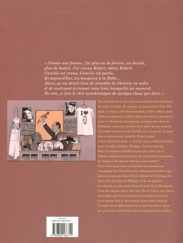 "J'avais une femme, j'ai plus eu de femme, un boulot, plus de boulot. J'ai connu Robert, adieu Robert. Camille est venue, Camille est partie. Et aujourd'hui, les bouquins à la flotte... Alors, ça me dirait bien de remettre la librairie en ordre et de continuer à creuser mon trou tranquille un moment. Tu vois, je fais le rêve anachronique de quelque chose qui dure." Les chemins de la vie sont souvent faits d'accélération, de coups de frein, de virages, de demi-tours. Pour Philippe, la route a été mouvementée. Cadre urbain, puis chômeur dépressif, coiffeur dans les trains à grande vitesse et désormais bouquiniste quelque part dans le Bordelais rural, il a divorcé de la mère de ses enfants, est tombé amoureux de Camille, l'a vue partir, l'a peut-être remplacée par Isabelle. Entre-temps, il s'est enivré de mots, a rêvé de vins, a cultivé l'amitié sans sacrifier l'amour. Philippe s'est reconstruit. Mais la tempête antédiluvienne qui s'abat sur le village, emportant les trésors de sa librairie d'occasion, ne risque-t-elle pas de l'envoyer par le fond ? Dans cette quatrième et dernière promenade en compagnie des Gens honnêtes, chronique tendre et généreuse par Jean-Pierre Gibrat et Christian Durieux, les chemins de Philippe et de ses proches les mènent au plus près d'eux-mêmes, là où l'humanité n'est pas laissée sur le bas-côté. Et s'il arrive que l'on se chamaille, que l'on se blesse ou se quitte, le sourire n'est jamais loin et, par dessus-tout, reste vibrante l'énergie de se débarrasser de ce qui encombre, de ce qui pèse, pour construire une vie toujours plus légère.