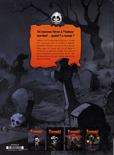 Un nouveau héros à l'humour mordant... quand il a mangé ! Même s'il est le plus mignon de tous, Tizombi n'en reste pas moins un zombie à l'appétit insatiable. Il dévore, avale, gobe et croque tout ce qui passe à portée de sa dentition acérée. Tout sauf la jeune Margotik, une humaine amoureuse de lui. Mais quand Cassandra, une redoutable zombie aussi belle que puissante, arrive à prendre le coeur de Tizombi ainsi que le contrôle du cimetière, rien ne va plus dans la non-existence des morts-vivants. A Margotik de relever deux défis : se débarrasser de l'intruse et éviter de lui servir de casse dalle pour son quatre-heures.