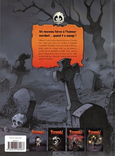 Un nouveau héros à l'humour mordant... quand il a mangé! Même s'il est le plus mignon de tous, Tizombi n'en reste pas moins un zombie à l'appétit insatiable. Véritable trou sans fond, à dévore, avale, gobe et croque tout ce qui passe à portée de sa dentition acérée. Tout, sauf la jeune Margotik qui écrit un livre sur lui elle est fascinée par celui qui reste le seul zombie à être né zombie