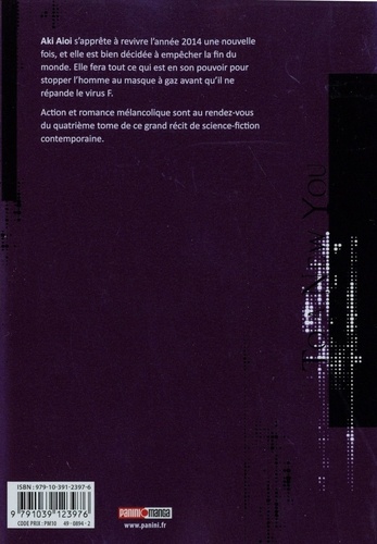 Aki Aioi s'apprête à revivre l'année 2014 une nouvelle fois, et elle est bien décidée à empêcher la fin du monde. Elle fera tout ce qui est en son pouvoir pour stopper l'homme au masque à gaz avant qu'il ne répande le virus F. Action et romance mélancolique sont au rendez-vous du quatrième tome de ce grand récit de science-fiction contemporaine.