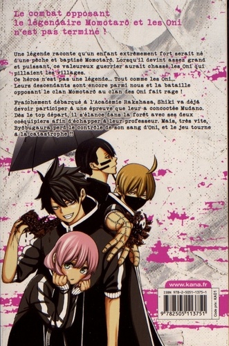 Le combat opposant le légendaire Momotarô et les Oni n'est pas terminé ! Une légende raconte qu'un enfant extrêmement fort serait né d'une pêche et baptisé Momotarô. Lorsqu'il devint assez grand et puissant, ce valeureux guerrier aurait chassé les Oni qui pillaient les villages. Ce héros n'est pas une légende... Tout comme les Oni... Leurs descendants sont encore parmi nous et la bataille opposant le clan Momotarô au clan des Oni fait rage ! Fraîchement débarqué à l'Académie Rakshasa, Shiki va déjà devoir participer à une épreuve que leur a concoctée Mudano. Dès le top départ, il s'élance dans la forêt avec ses deux coéquipiers afin d'échapper à leur professeur. Mais, très vite, Byôbugaura perd le contrôle de son sang d'Oni, et le jeu tourne à la catastrophe !!