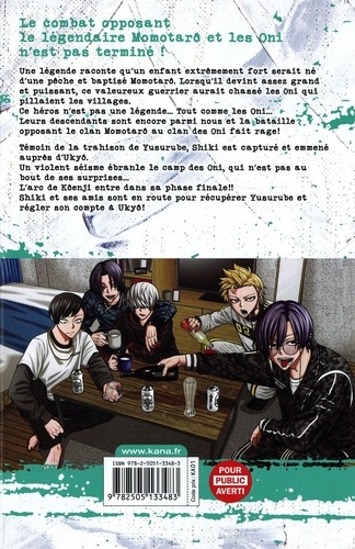 Une légende raconte qu'un enfant extrêmement fort serait né d'une pêche et baptisé Momotarô. Lorsqu'il devint assez grand et puissant, ce valeureux guerrier aurait chassé les Oni qui pillaient les villages. Ce héros n'est pas une légende... Tout comme les Oni... Leurs descendants sont encore parmi nous et la bataille opposant le clan Momotarô au clan des Oni fait rage ! Témoin de la trahison de Yusurube, Shiki est capturé et emmené auprès d'Ukyô. Un violent séisme ébranle le camp des Oni, qui n'est pas au bout de ses surprises... L'arc de Kôenji entre dans sa phase finale !! Shiki et ses amis sont en route pour récupérer Yusurube et régler son compte à Ukyô !