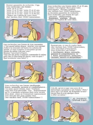 Vous avez à ce jour dans votre panier : Josiane, 37 ans, secrétaire de direction, Jocelyne, 26 ans, bibliothécaire, Josy, 41 ans, historienne médiéviste, Josette, 38 ans, actuellement à la recherche d'un emploi, Cynthia, 31 ans, comédienne. Souhaitez-vous continuer vos courses, ou passer à la caisse?