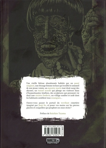 Une vieille bâtisse abandonnée habitée par un passé sanglant, une étrange femme recluse qui trouble le sommeil de son jeune voisin, un monstre marin tout droit surgi des abysses, un tunnel maudit qui plonge ses visiteurs dans d'hypnotisantes ténèbres, des sculptures qui prennent vie dans une sinistre fonderie, un village sombre et isolé dont les habitants semblent tous exsangues... Oserez-vous passer le portail du terrifiant cimetière imaginé par Junji Ito, et poser vos mains sur les pierres glacées et craquelées qui peuplent ces onze récits ? Cette édition bénéficie d'une préface du Keiichiro Toyama (Silent Hill) et d'une analyse en fin d'ouvrage par Morolian, spécialiste francophone de l'auteur.