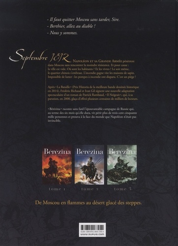 Septembre 1812 Napoléon et sa Grande Armée pénètrent dans Moscou sans rencontrer la moindre résistance. Et pour cause la ville est vide. Où sont les habitants ? Et les vivres ? Le soir même, le quartier chinois s'embrase. L'incendie gagne vite les maisons de sapin. Impossible de lutter : les pompes à incendie ont disparu. C'est un piège ! Après "La Bataille" (Prix Historia de la meilleure bande dessinée historique en 2014), Frédéric Richaud et Ivan Gil signent une nouvelle adaptation spectaculaire d'un roman de Patrick Rambaud, "Il Neigeait", qui, à sa parution, en 2000, glaça d'effroi plusieurs centaines de milliers de lecteurs.