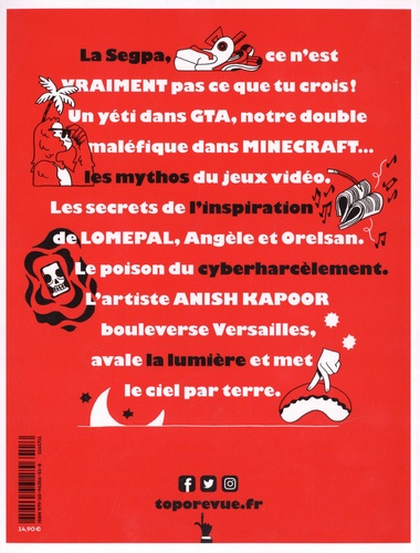 La Segpa, ce n'est vraiment pas ce que tu crois ! Un yéti dans GTA, notre double maléfique dans Minecraft... les mythos du jeu vidéo. Les secrets de l'inspiration de Lomepal, Angèle et Orelsan. Le poison du cyberharcèlement. L'artiste Anish Kapoor bouleverse Versailles, avale la lumière et met le ciel par terre.