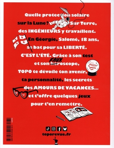 Quelle protection solaire sur la Lune ? Sur Terre, des ingénieurs y travaillent. En Géorgie, Salomé, 18 ans, se bat pour sa liberté. C'est l'été. Grâce à son test et son fauxroscope, Topo te dévoile ton avenir, ta personnalité, les secrets des amours de vacances...et t'offre quelques jeux pour t'en remettre.