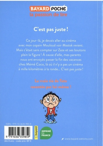 Ce jour-là, je devais aller au cinéma avec mon copain Mouloud voir Mastok revient. Mais c'était sans compter sur Zara et ses boutons plein la figure ! A cause d'elle, mes parents nous ont envoyés passer la fin des vacances chez Mémé Coco, là où il n'y a pas un cinéma à mille kilomètres à la ronde... C'est pas juste !