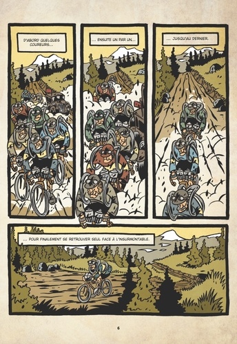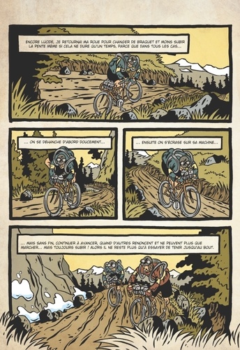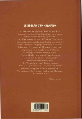 "Le cyclisme a toujours eu de riches anecdotes à raconter, parfois drôles, dramatiques ou joyeuses, et bien souvent devenues légendaires. Au début des années 1900, le Tour de France était une aventure sportive et humaine livrée à tous les vents ! Face à l'adversité, aux pièges de la route et aux aléas de la course, les champions d'hier ont marqué notre imaginaire, à force d'exploits, de défaillance, de courage, mais aussi de coups tordus. Frédéric Kinder, avec son joli coup de crayon et sa passion du cyclisme, nous raconte savoureusement les turpitudes des "forçats de la route" de cette époque. Ainsi va la légende du vélo... toujours bien vivante grâce aux champions, d'hier et aujourd'hui. Un vrai tour de force et une vraie histoire d'hommes. Bonne lecture." Charly Mottet