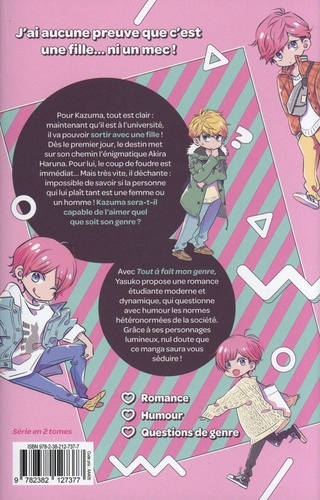 Avec Tout à fait mon genre, Yasuko propose une romance étudiante moderne et dynamique, qui questionne avec humour les normes hétéronormées de la société. Grâce à ses personnages lumineux, nul doute que ce manga saura vous séduire ! Pour Kazuma, tout est clair : maintenant qu'il est à l'université, il va pouvoir sortir avec une fille ! Dès le premier jour, le destin met sur son chemin l'énigmatique Akira Haruna. Pour lui, le coup de foudre est immédiat... Mais très vite, il déchante : impossible de savoir si la personne qui lui plaît tant est une femme ou un homme ! Kazuma sera-t-il capable de l'aimer quel que soit son genre ?