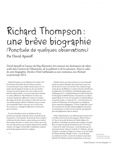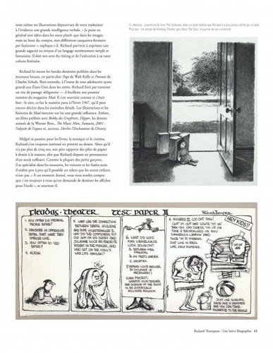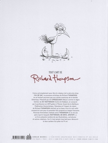 Connu principalement pour être le créateur de la série de strips Cul de sac, la prouesse artistique de Richard Thompson ne se limitait pourtant pas aux seules aventures de la famille Otterloop. Présenté par Art Spiegelman (Maus) comme le digne héritier de Bill Watterson (Calvin & Hobbes), et consacré par la profession en 2015 grâce à l'Eisner Award de la Meilleure Publication Humoristique, l'étendue et l'impact du talent de Richard Thompson méritait qu'un beau-livre lui soit enfin consacré et soit pour la première fois proposé en langue française. Ponctué d'entretiens réalisés entre Thompson et six de ses pairs (parmi lesquels Watterson, De Seve, Apatoff...), ce livre présente nombre de ses illustrations, caricatures et autres créations. Car il n'est jamais trop tard pour découvrir la face cachée d'un pilier du 9e art.