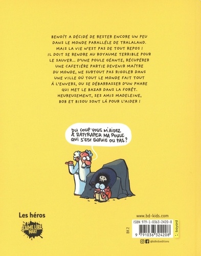 C'est une catastrophe : le giga-canon qui devait le ramener chez lui, a explosé, alors qu'enfin Benoît avait trouvé des piles pour le faire fonctionner... Heureusement, Madeleine est là pour le soutenir. Et puis le garçon s'accomode de ses autres amis, Bisou le loup, et Bob, le savant sans tête. Piégé dans un monde parallèle, Tralaland, Benoît aimerait bien pouvoir rentrer, mais quand il en aura envie. Parce qu'en fait, il est bien là-bas. Même si parfois...