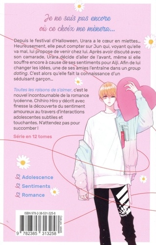 Depuis le festival d'Halloween. Urara a le coeur en miette... Heureusement, elle peut compter sur Jun qui, voyant qu'elle va mal, lui propose de venir chez lui. Après avoir discuté avec son camarade, Urara décide d'aller de l'avant, même si elle souffre encore à cause de ses sentiments pour Aiji. Afin de lui changer les idées, une de ses amies l'entraîne dans un group dating. C'est alors qu'elle fait la connaissance d'un séduisant garçon... Toutes les raisons de s'aimer, c'est le nouvel incontournable de la romance lycéenne. Chihiro Hiro y décrit avec finesse la découverte du sentiment amoureux au travers d'interactions adolescentes subtiles et touchantes. N'attendez pas pour succomber !