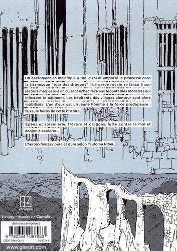 Citadelle suspendue attend fermier taciturne... Un nécromancien maléfique a tué le roi et emporté la princesse dans la titanesque "tour des dragons" ! La garde royale se lance à son secours mais est mise en déroute par les redoutables monstres qui infestent le bâtiment. Les habitants des villages alentour sont alors mobilisés. L'un d'eux est un jeune homme à la force prodigieuse : Yuva, le héros de cette histoire. Après les étoiles et les voyages spatiaux, l'auteur de Blame ! s'attaque à la fantasy. Son trait gagne en clarté et l'on y retrouve les thématiques qui lui sont chères, présentées sous un nouveau jour. Une porte d'entrée idéale pour les curieux avides de nouveaux univers et une valeur sûre pour tous les fans de l'auteur !