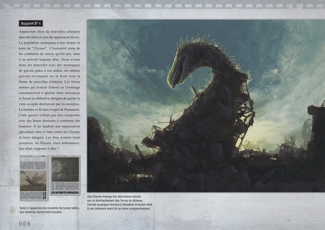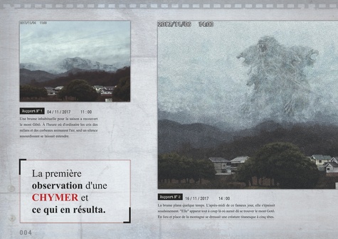 Découvrez les dossiers militaires secrets sur l'invasion des Chymers au Japon ! Page après page et dans l'ordre chronologique du manga, les créatures sont ici présentées comme dans un rapport militaire secret. Un côté vrai/faux bluffant, dans l'esprit de La Guerre des mondes de Wells. L'auteur ne s'est pas contenté d'un art book illustratif. Se présentant comme un témoin de la catastrophe, il a regroupé ses tableaux et travaux artistiques en " dossiers secrets ", fourmillant d'informations autour des créatures qui font écho à ce que le lecteur découvre dans le manga. La mise en couleurs et un trait hyperréaliste contribuent à la qualité du travail. Un ouvrage à lire comme à contempler.