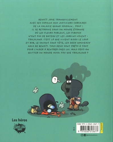 Benoît joue avec ses copains aux justiciers corsaires de la galaxie quand... pouf ! Il disparaît et se retrouve projeté à Tralaland. Tralaland est un monde bizarre, absurde, complètement fou ! C'est là que vivent Bisou le loup et Bob le savant sans tête. Ils vont tout faire pour aider Benoît à retourner chez lui. Mais... Comment se fier à un savant qui a perdu la tête ? Comment se repérer dans un monde qui n'a ni queue ni tête ? Un jour enfin, ouf, Benoît trouve le moyen de rentrer chez lui : un ENORME canon. Mais... plus de piles ! Et pour trouver des piles neuves dans Tralaland, c'est toute une histoire... ! Et alors qu'après un périple trèèès long et plein de dangers, il en tient enfin une entre ses mains, catastrophe : le giga-canon explose... Mais est-ce si grave ? Car Benoît s'amuse beaucoup dans Tralaland !