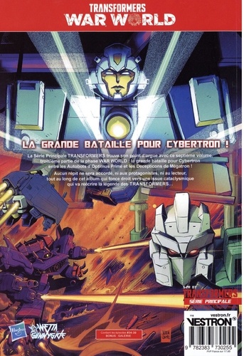 La Série Principale TRANSFORMERS trouve son point d'orgue avec ce septième volume, troisième partie de la phase WAR WORLD : l'immense bataille pour Cybertron entre Autobots et Decepticons ! Aucun répit ne sera accordé, ni aux protagonistes, ni au lecteur, tout au long de cet album qui fonce tout droit vers un issue cataclysmique qui va réécrire la légende des Transformers... Illustré par Anna Malkova, qui s'est imposée comme l'une des meilleures artistes sur les titres Transformers, avec la participation de Guido Guidi (Revolutionaries), Andrew Griffith (G. I. Joe, A Real American Hero ! ) et Winston Chan (Beast Wars).