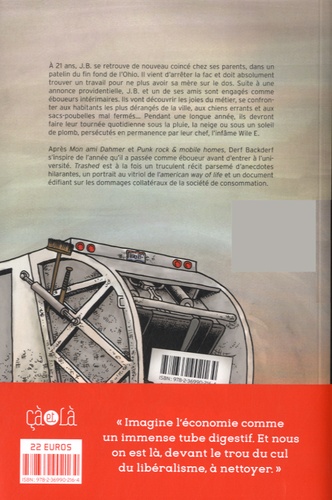 A 21 ans, J.B. se retrouve de nouveau coincé chez ses parents, dans un patelin du fin fond de l'Ohio. II vient d'arrêter la fac et doit absolument trouver un travail pour ne plus avoir sa mère sur le dos. Suite à une annonce providentielle, J.B. et un de ses amis sont engagés comme éboueurs intérimaires. Ils vont découvrir les joies du métier, se confronter aux habitants les plus dérangés de la ville, aux chiens errants et aux sacs-poubelles mal fermés... Pendant une longue année, ils devront faire leur tournée quotidienne sous la pluie, la neige ou sous un soleil de plomb, persécutés en permanence par leur chef, l'infâme Wile E. Après Mon ami Dahmer et Punk rock & mobile homes, Derf Backderf s'inspire de l'année qu'il a passée comme éboueur avant d'entrer à l'université. Trashed est à la fois un truculent récit parsemé d'anecdotes hilarantes, un portrait au vitriol de l'american way of lite et un document édifiant sur les dommages collatéraux de la société de consommation.