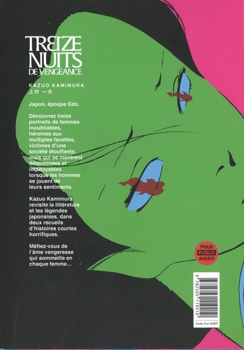 Japon, époque Edo. Découvrez treize portraits de femmes inoubliables, héroïnes aux multiples facettes, victimes d'une société étouffante, mais qui se montrent déterminées et impitoyables lorsque les hommes se jouent de leurs sentiments. Kazuo Kamimura revisite la littérature et les légendes japonaises, dans deux recueils d'histoires courtes horrifiques. Méfiez-vous de l'âme vengeresse qui sommeille en chaque femme...