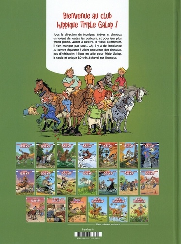 Bienvenue au club hippique Triple Galop ! Sous la direction de Monique, élèves et chevaux en voient de toutes les couleurs, et pour leur plus grand plaisir. Quant à Bébert, le vieux palefrenier, il n'en manque pas une... Ah, il y a de l'ambiance au centre équestre ! Alors amoureux des chevaux, pas d'hésitation ! Tous en selle pour Triple Galop, la seule et unique BD très à cheval sur l'humour.