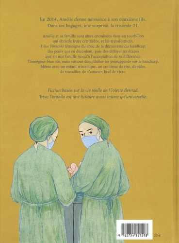 Avec la naissance d'un enfant trisomique, une famille est entraînée dans un tourbillon qui ébranle ses certitudes et la transforme. Triso Tornado témoigne du choc de la découverte du handicap, des peurs qui en découlent, puis des différentes étapes que vit une famille jusqu'à l'acceptation de sa différence. Témoigner bien sûr, mais surtout démythifier les présupposés sur le handicap. Même avec un enfant trisomique, on continue de rire, de râler, de travailler, de s'amuser, bref de vivre. L'histoire raconte comment s'accompagne, avec l'aide des professionnels, le développement de Nils lors des trois premières années de sa vie : le quotidien, les rendez-vous d'orthophonie, de kinésithérapie, les petits "trucs" qu'on l'on trouve pour faire grandir son enfant malgré ses difficultés. Il est aussi question d'avortement : en France, 96% des parents qui apprennent la trisomie de leur bébé pendant la grossesse choisissent l'IVG. C'est le signe d'une grande angoisse. Comment vit-on avec ce handicap ? Comment vaincre la peur ? Et si l'humour et l'amour en étaient les armes les plus efficaces ? Fiction basée sur la vie réelle de Violette Bernad, Triso Tornado est une histoire aussi intime qu'universelle. Avec élégance et subtilité, Camille Royer a dessiné des "sourires en coin" et donné au récit l'esprit malicieux qu'il lui fallait.