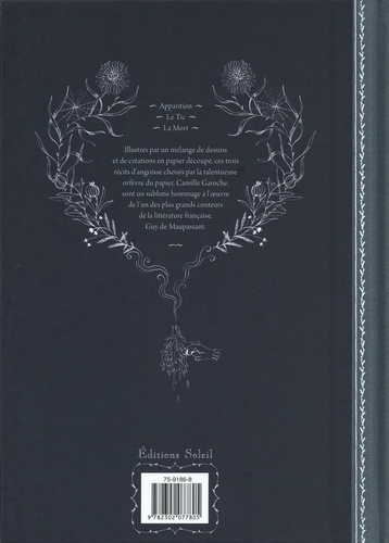 Trois contes de fantômes propose trois nouvelles fantastiques écrites par Guy de Maupassant, choisies et illustrées par Camille Garoche, véritable orfèvre du papier découpé. Apparition s'intéresse à une histoire étrange survenue au marquis de la Tour-Samuel, alors qu'il était âgé d'une vingtaine d'années, et qui le hante depuis... Le Tic est le récit d'un père, affligé d'un tic singulier, qui raconte les mystérieuses raisons qui incitent sa fille à porter un gant à la main gauche... Enfin, La Mort nous immerge dans les souvenirs du narrateur dont la femme est morte, lorsque d'étranges phénomènes se produisent... Trois contes de fantômes propose trois nouvelles fantastiques écrites par Guy de Maupassant, choisies et illustrées par Camille Garoche, véritable orfèvre du papier découpé. Apparition s'intéresse à une histoire étrange survenue au marquis de la Tour-Samuel, alors qu'il était âgé d'une vingtaine d'années, et qui le hante depuis... Le Tic est le récit d'un père, affligé d'un tic singulier, qui raconte les mystérieuses raisons qui incitent sa fille à porter un gant à la main gauche... Enfin, La Mort nous immerge dans les souvenirs du narrateur dont la femme est morte, lorsque d'étranges phénomènes se produisent...