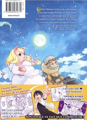 Envoyé dans un autre monde à cause de ses parents... Son voyage ne fait que commencer ! Makoto Misumi, le héros de cette histoire, est invoqué malgré lui dans un autre monde à cause d'un contrat signé par ses parents. Et, manque de chance, la déesse de ce monde le trouve trop laid et décide de l'envoyer vivre dans des terres sauvages aux confins du monde... ! Invoqué malgré lui... Recalé comme héros... Seul dans un autre monde... Le premier tome des pérégrinations dans un autre monde d'un héros malchanceux !! Malgré toutes ses galères, il obtient des pouvoirs complètement cheatés !!