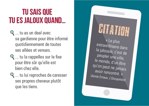 Tu sais que tu es jaloux(se) quand... ... tu lui proposes de participer à L'Ile de la tentation pour tester ses limites. ... tu pistes toutes ses ex sur les réseaux sociaux. ... tu lui reproches de caresser ses propres cheveux plutôt que les tiens. Un peu, beaucoup, à la folie... Si la jalousie te plombe la vie, ce livre est fait pour toi !