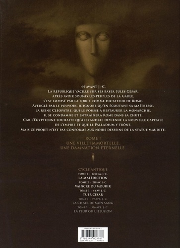44 avant J.-C. La république vacille sur ses bases. Jules César, après avoir soumis les peuples de la Gaule, s'est imposé par la force comme dictateur de Rome. Aveuglé par le pouvoir, il ignore qu'en écoutant sa maitresse, la reine Cléopâtre, qui le pousse à restaurer la monarchie, il se condamne et entraînera Rome dans sa chute. Car l'Egyptienne souhaite qu'Alexandrie devienne la nouvelle capitale de l'empire et que le palladium y trône. Mais ce projet n'est pas conforme aux noirs desseins de la statue maudite. Rome ! Une ville immortelle. Une damnation éternelle.