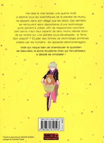 Par-delà la Voie lactée, une guerre civile a décimé tous les scientifiques de la planète de Mumu, ne laissant dans son sillage que les Idiots. Ces derniers se retrouvent alors dépositaires d'une technologie qu'ils peinent à utiliser. Afin de réapprendre comment s'en servir, il leur faut repartir de zéro. Mumu décide donc de se rendre sur une planète sous-développée : la Terre. Son objectif ? Etudier des formes de technologie primitives créées par les humains : les appareils électroménagers. Voilà qui risque bien de chambouler le quotidien de Sakurako, la jeune étudiante chez qui l'envahisseur a décidé de s'installer ! Traduit du japonais par Gabrielle Rodelet Lettrage de Charlotte Piquet