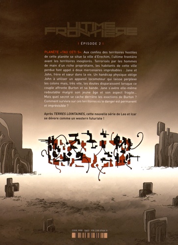 2e tome de la nouvelle série fantastique imaginée par Leo et Icar ! Voici le 2e épisode d'Ultime frontière, une nouvelle série fantastique. Située sur la planète "Tau Ceti 5" , la ville d'Erechim est le dernier endroit civilisé, l'ultime frontière avant les territoires inconnus. Terrorisés par un riche propriétaire, les habitants font appel à deux mercenaires : Jane et John. Ces frère et soeur vont devoir affronter une bande organisée qui, pour une raison encore inconnue, sème la terreur et entend posséder les terres, quels que soient les moyens à employer... Un western futuriste ! 2e volet d'Ultime frontière, la nouvelle série de Leo et Icar, destinée à public de jeunes adultes fan de western fantastique !