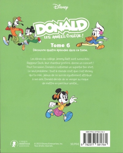 Découvrez le sixième tome des aventures délirantes de Donald et ses amis durant leurs années collège ! Cette bande dessinée de 96 pages comprend une présentation des personnages et 4 épisodes. A lire dès 7 ans. Les élèves du collège Jeremy Ratt sont surexcités : Rappeur Duck, leur chanteur préféré, donne un concert ! Pour l'occasion, Donald a customisé un superbe tee-shirt. Le seul problème : tout le monde croit que c'est Mickey qui l'a créé. Jaloux de ce succès injustement attribué à son ami, Donald décide de se venger au risque de mettre en péril leur amitié...