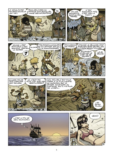 Il était temps, l'équipage de la Kouklamou a enfin mis la main sur un trésor ! Mais soumis au poids de tout cet or, le navire ne tarde pas à passer en dessous de la ligne de flottaison et à prendre l'eau saccageant ainsi tous les livres de la bibliothèque du Capitaine ! Le problème, c'est que l'un d'entre eux, Consolation, a été emprunté à un navire-bibliothèque à la politique très stricte : "saisie totale des biens de l'emprunteur en cas de non-retour du livre" ! Le Capitaine, Romuald et tous les autres n'ont d'autre choix que de partir en quête de l'ouvrage en question s'ils ne veulent pas perdre leur magot si durement acquis. Pas gagné alors que la crise du livre fait rage et que les librairies ferment toutes les unes après les autres... Les jeux de mots potaches et les situations absurdes reviennent de plus belle dans cette nouvelle aventure du plus barré des équipages de pirates, mené par les talentueux matelots Pilet et Pothier !