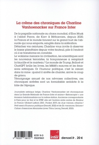 La crème des chroniques de Charline Vanhoenacker sur France Inter. De la pagaille nationale aux chaos mondial, d'Elon Musk à l'abbé Pierre, de Kiev à Bétharram, depuis 2020, la France et le monde foncent sur le grand huit de l'absurde qui nous emporte, sanglés dans la sidération. Détachez vos ceintures, Charline vous invite à observer le bazar planétaire depuis votre fauteuil, pile à l'endroit où il se transforme en comédie. Le wokisme menace la civilisation, les scientifiques sont les nouveaux terroristes, la tronçonneuse a remplacé la faucille et le marteau ? Le monde de Trump, Bolloré et ChatGPT brûle les livres, les M&M's mauves et les émissions satiriques. Or l'humour politique, c'est le canari dans la mine : quand il arrête de chanter, arrive le coup de grisou. Témoignage amusé de nos névroses collectives, ces chroniques acérées sont un formidable antidote à la folie de l'époque.