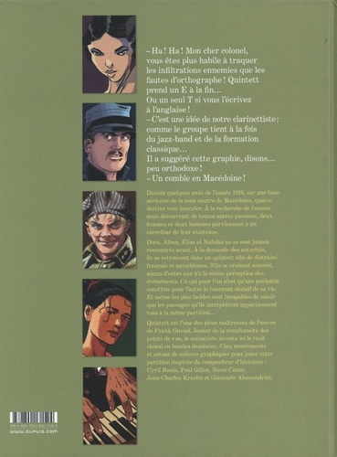Durant quelques mois de l'année 1916, sur une base aérienne de la zone neutre de Macédoine, quatre destins vont basculer. A la recherche de l'amour mais découvrant de toutes autres passions, deux femmes et deux hommes parviennent à un carrefour de leur existence. Dora, Alban, Bilas et Nafsika ne se sont jamais rencontrés avant. A la demande des autorités, ils se retrouvent dans un quintett afin de distraire français et autochtones. S'ils se croisent souvent, aucun d'entre eux n'a la même perception des événements. Ce qui pour l'un n'est qu'une péripétie constitue pour fauter le tournant décisif de sa vie. Et même les plus lucides sont incapables de saisir que les passages qu'ils interprètent appartiennent tous fi la même partition... Quintett est l'une des pièce maîtresses de l'oeuvre de Frank Giroud. Jouant de la simultanéité des points de vue, le scénariste invente ici le récit choral en bandes dessinées. Cinq mouvements et autant de solistes graphiques pour jouer cette partition inspirée du compositeur d'histoires : Cyril Bonin, Paul Gillon, Steve Cuzor, Jean-Charles Kraehn et Giancarlo Alessandrini.