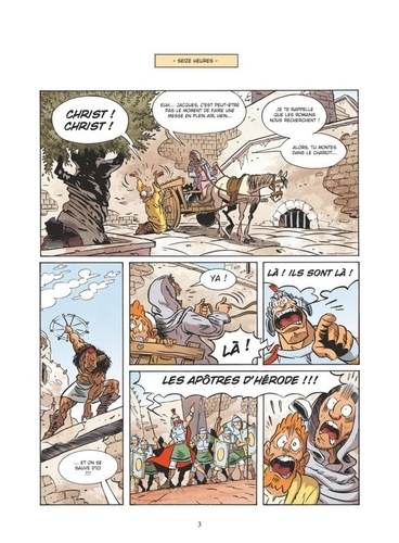 Jérusalem, dimanche de Pâques de l'an 33 après Jésus-Christ. 16h00. Alors que les apôtres sont pourchassés par tous, que les Romains se préparent à mettre la ville à feu et à sang sur ordre du nouvel envoyé de Rome, le terrible Caïus, et que les zélotes s'apprêtent enfin à lancer leur révolution par les catacombes de la ville, deux apôtres, les deux Jacques, oubliés de tout le monde, viennent de trouver le fameux "chariot d'Hérode" recherché par tous depuis des heures, avec un corps enrubanné à l'intérieur.