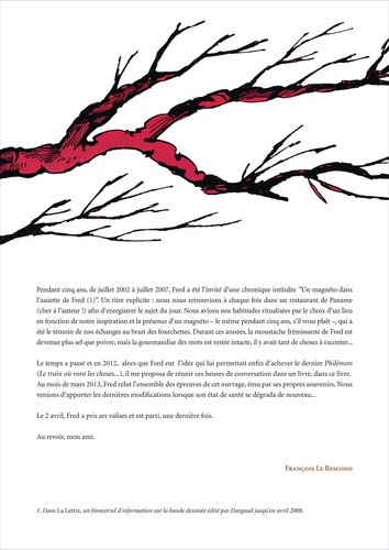 Avec Un magnéto dans l’assiette de Fred, l’auteur et son éditeur nous invitent dans les coulisses de « L’officiel de la BD », la rubrique qu’ils animent dans La Lettre de Dargaud. Un magnéto dans l’assiette de Fred a enregistré chacun des déjeuners au cours desquels l’auteur et son éditeur ont préparé leur rubrique. Autour de la table, l’auteur a abordé tous les sujets. Cet ouvrage très vivant reprend l’ensemble de ces entretiens ; il est enrichi d’illustrations et de documents rares et inédits. Chaque témoignage se lit comme une nouvelle et permet de redécouvrir l’importance « définitive » de cet auteur hors norme, alors que paraît le dernier album de Philémon, « Le train où vont les choses… ». Un magnéto dans l’assiette de Fred réunit des entretiens de l’auteur avec son éditeur, mais aussi des documents inédits ; une rencontre avec le père de Philémon, un maître de la BD.