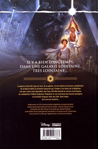 La guerre civile fait rage au coeur de la galaxie, et une alliance de braves combattants de la liberté défie la tyrannie instaurée par l'Empire. Ces héros de la Rébellion ont pour noms Luke Skywalker, Han Solo, Obi-Wan Kenobi ou encore Leia Organa. Ils combattent l'infâme Empereur Palpatine et son exécutant des basses besognes, le terrifiant Seigneur Noir des Sith, Dark Vador. Ceci est leur histoire... Redécouvrez en 3D la toute première adaptation en bande dessinée du plus grand space opera de tous les temps, créé par George Lucas ! Scénarisée par Roy Thomas et dessinée par Howard Chaykin, cette édition 3D est spécialement présentée à l'occasion du 40e anniversaire de la sortie de ce film qui s'appelait alors La Guerre des étoiles.