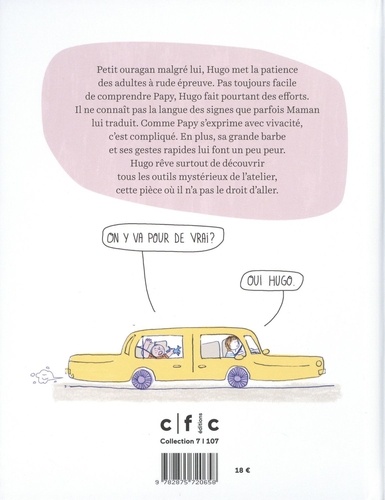 Hugo se rend pour quelques jours avec sa maman chez son grand-père. En froid depuis quelque temps, les relations entre les deux adultes sont parfois tendues. Entre eux deux, le petit garçon, assoiffé de découverte et d'aventure, explore cette maison qu'il connaît peu. Une pièce en particulier l'intéresse au sous-sol : l'atelier du grand-père où trônent des machines mystérieuses et dangereuses. Hugo est très curieux de savoir ce que son papy y fabrique même s'il a un peu peur de lui. Avec sa longue barbe et son air bourru, il impressionne l'enfant. Mais surtout, l'homme est sourd-muet et communique par la langue des signes, un langage qu'Hugo a du mal à comprendre. Les gestes du vieux barbu sont brusques et sa patience vite agacée. Avec son imaginaire inépuisable, l'enfant se confronte à un monde d'adultes qu'il a parfois du mal à cerner. A force de ténacité, nos trois personnages vont pourtant parvenir à se faire confiance et à se rapprocher. Un album à découvrir dès 9 ans dont l'originalité tient notamment à la découverte de la réalité des personnes atteintes de surdité.